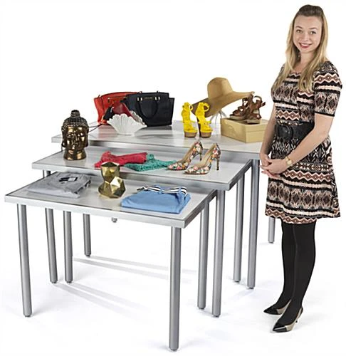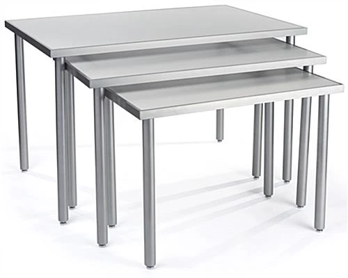 These 3 piece nesting tables have a contemporary design to complement your retail shop as they show off your merchandising. They have a steel frame with scratch resistant MDF tabletops for a sturdy structure that will last. These modern style nesting tables have a semi-gloss white melamine finish to accent your shop décor and merchandising. Each fixture in the set has non-slip pads to ensure it remains stable throughout a busy day. Use the lowest tabletop to lay out folded pairs of jeans, the middle for this season’s stylish tops and highest tier to display matching accessories. They are great as a tiered set or place them throughout your store separately if desired. These nesting tables have a modern style with a leveled design that provides various display options for every retail store.