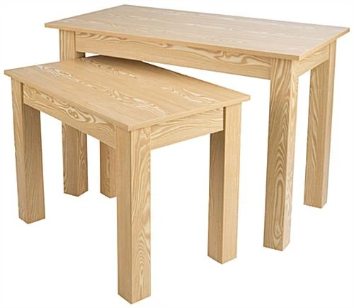 These wood nesting tables come in a set of 2, making them ideal furniture for any store or home setting. When used as a rustic retail display, customers can stock the units with merchandise, signage, and decorations. A set of two nesting tables fit against a store wall or look great in the middle of a display room. While each furniture pair is made of particle board and melamine, the exterior is finished with rustic ash wood. Match these nesting tables with existing retail display décor with ease. At 45” wide, you’ll never be lacking space to promote items!
