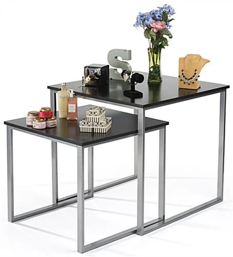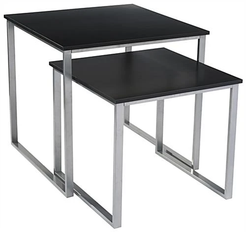 These contemporary nesting tables are the ideal display set for your retail shop with the sturdy design and modern appearance. A scratch resistant surface is made of MDF with a semi-gloss black tabletop to keep it looking new as the crowds bustle in. These stylish nesting tables come as a set of 2 that can be used for tiered displays of clothing or boutique essentials. The modern style makes for an attractive display for your merchandising selection and is sure to blend in well with any retail décor. Featuring a padded non-slip bottom, the units remain in place as customers browse the selection laid out. The powder coated steel frame provides lasting strength with a stylish design for your chic shop. These nesting tables offer a sturdy build suitable for all your merchandising needs and a modern style that will complement any business.