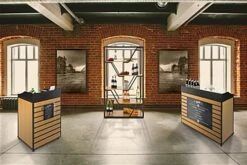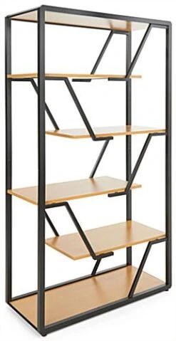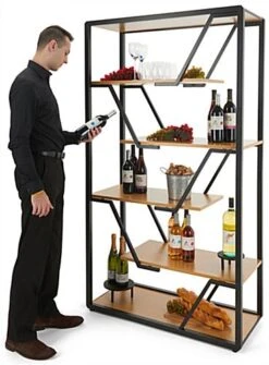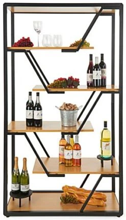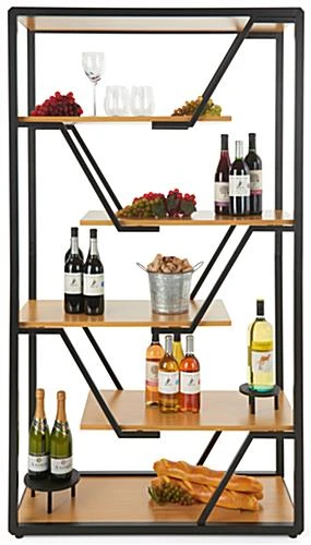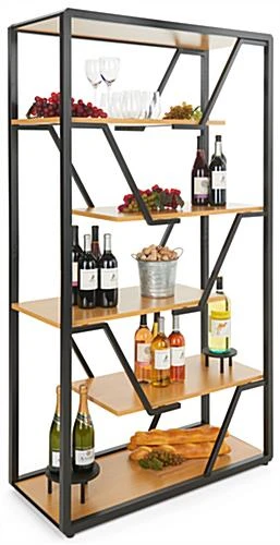 Our geometric floor shelf will be a wonderfully modern addition to wine shops, coffee shops, hotel lobbies, office spaces, gift shops, and retail stores. This contemporary fixture has an upscale offset build that will help draw customers’ attention to your merchandise. The unique geometric floor shelf has a powder-coated steel frame that truly pops against the light natural wood finish. The contemporary metal and wood unit is made from FSC certified MDF material and melamine laminate. Each tier of this robust geometric floor shelf can hold up to 40lbs, allowing ample possibilities for exhibiting products and stock. Our powder-coated metal and wood fixture is sold exclusively at Displays2go and will be a fabulous enhancement to retail stores and cafes.