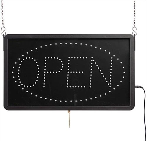 This illuminated display, animated LED open sign tells potential customers that a location is ready for business! Even at night, passersby won’t be able to miss this glowing display in a window thanks to the red and blue oscillating lights this sign features. This LED open Sign that is 22″ across, also known as a bright programmable display, is featured in a number of retail stores and business locations that wish to clearly communicate their status to potential patrons. The sleek black plastic design of the illuminated exhibit nicely accentuates the design of many stores, diners, banks, and other establishments.