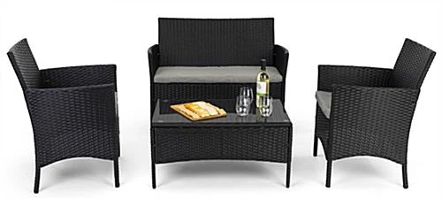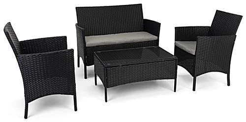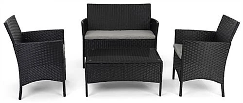 Purchase this outdoor sofa and chair set as a way to invite your patrons to enjoy their favorite latte or beverage. Update the look of your restaurant patio, or bistro with this 4-piece durable synthetic rattan lounge set, which includes loveseat, two armed seats, and a coffee table. This outdoor sofa and chair set features a steel frame, all-weather dark brown synthetic rattan, and removable seat cushions and machine washable. Whether used inside or outside, this durable synthetic rattan lounge set is a must-have for your restaurant, café, or tradeshow space. Try setting these pieces together or use the set of two armed chairs wherever extra seating is needed. Create an enticing atmosphere that patrons will want to visit when you place this sofa and chair set with coffee table in your establishment.