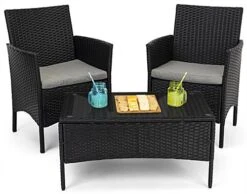 Outdoor Sofa and Chair Set w/ Tempered Glass Coffee Table and Synthetic Rattan Material