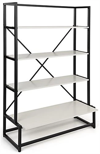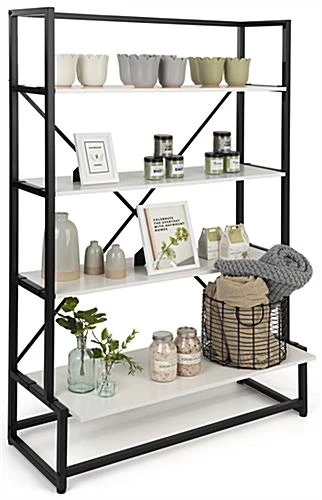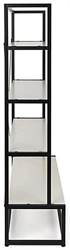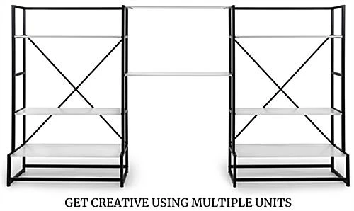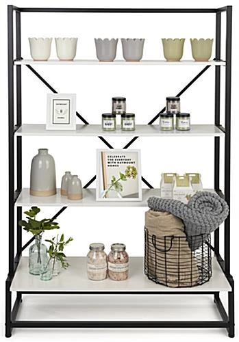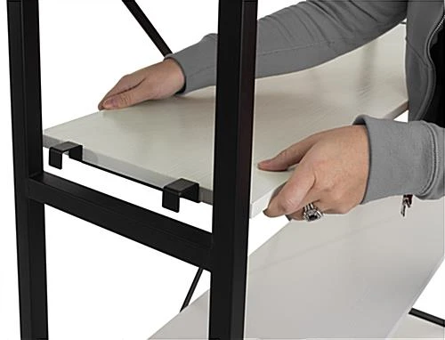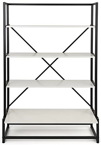 Our folding multi-tier retail shelving is the ideal fixture for showcasing your best merchandise in retail stores, pop-up sale locations, trade shows, and more! This 4-tier portable display allows your products to be the main focus of any presentation without clashing with the decor style of your space. This folding multi-tier retail shelving with modular design features a durable iron frame with a black powder-coated finish to endure the damaging effects of a busy retail environment. Designed to be used for temporary setups, each collapsible shelf fixture assembles and disassembles quickly. The lightweight construction of this folding multi-tier retail shelving rack allows it to be highly portable, perfect for traveling exhibits such as craft fairs, art festivals, and farmer’s markets. Pair more than one of these 4-tier modular fixtures together for a custom display that meets your merchandising needs. Additionally, use our rollable soft carry bag ( sold separately) to conveniently transport this lightweight display or store it away safely when not in use. Stand out against neighboring showcases with this portable shelf rack that is sure to grab your audience’s attention and leave a lasting impression long after they leave your space.