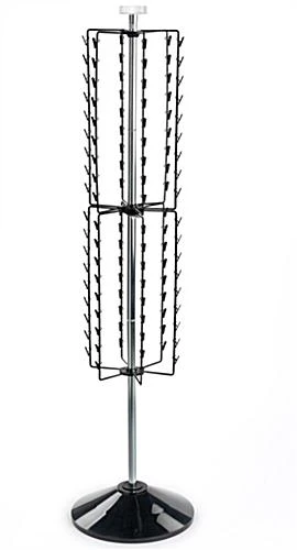 This potato chip rack is an ideal merchandising tool for retail environments such as convenience stores, supermarkets, gas stations, cafés, delis, and dining halls. Each snack strip stand is used to display food products such as pretzels, candy, bagged goods, and blister pack items. Each floor standing wire potato chip rack is equipped with strips that accommodate a total of 108 black clamps and make each item more visible to your customers. Use this rotating impulse merchandising strip to entice last minute sales at checkout or between store aisles. Our potato chip racks hold a variety pre-packaged goods, giving your customers a large selection of flavors and snack types. This attaching feature makes it easy to replenish the fixture with merchandise. This wire potato chip rack neatly and prominently displays packaged snacks and items with a simple design.