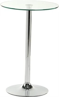 This dining furniture collection, glass high top table and chairs help to refurbish a kitchen or bar. Providing a contemporary allure to any room, this design can completely transform a space’s décor. This glass high top table and chairs for kitchen dining comes complete with one tabletop and two stools. The countertop is made of a tempered glass top and a chrome base giving it a sleek cosmopolitan design. The pedestal is in a fixed position at 33” tall making it an ideal tabletop for dining. The two stools are made of bent wood emphasizing simplicity and modernity which is ideal for any space. The wooden seat’s ergonomic curvature is supported by a chrome plated base and foot rest that can be adjusted from 26” to 33” high. The stools can also swivel 360° for a wide range of motion. This glass high top table and chairs provide a room with modern dining furniture. Making a statement at home or in the hospitality industry comes natural with this beautiful, quality-made furniture collection! This round glass high top table and chairs is an artistic innovation for contemporary dining, with a taste of elegance and ambiance. This stunning dining furniture set can be used at home for conversation over coffee and game nights, or at a bistro for a romantic dinner.