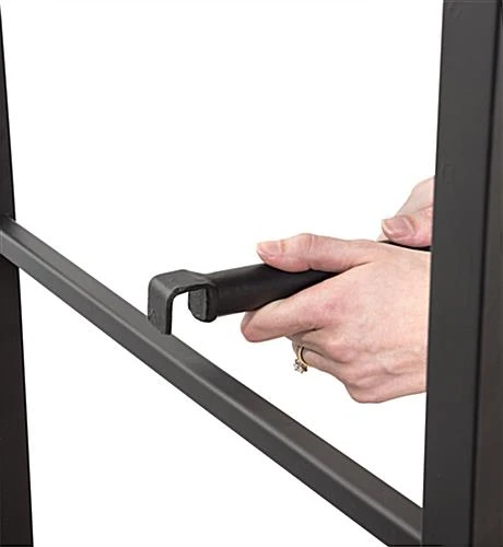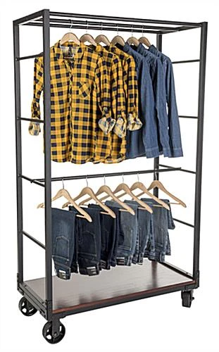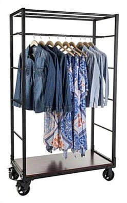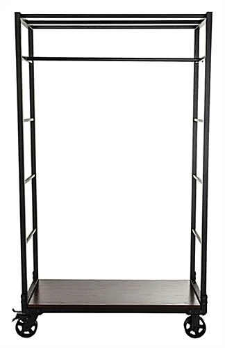 Style your retail store clothing with an industrial wheeled garment display rack. Two locks provide stability for the rolling fixture’s flat tread iron casters. Each rustic pipe wheeled garment display rack features a mahogany wood bottom shelf. Arrange clothing collections using the removable rail which installs along the ladder-inspired sides. Incorporate this rustic pipe fixture into your retail store for an urban style. The garment display rack provides an essential rolling organizer.