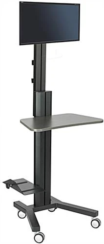 Reap the ergonomic health benefits of this stand up workstation. The height adjustable mount allows the monitor to be perfectly positioned to your liking while sitting or standing. Each multi-functional workstation includes a sliding keyboard shelf and CPU holder. Designed with 4 casters, 2 of which are lockable, this cart can be to be stationed in one area or wheeled wherever necessary without difficulty. In addition to being height adjustable, the mount tilts and rotates with ease to be viewed in either portrait or landscape orientation. Use this ergonomic cart in your office, school, or other professional setting as a workstation that is constructed to meet your needs.