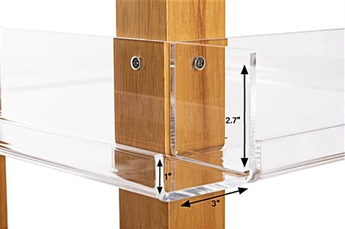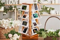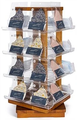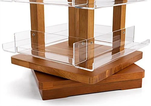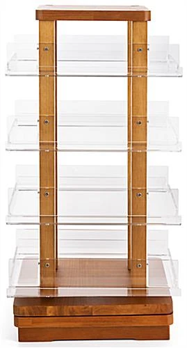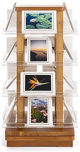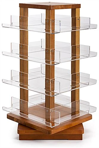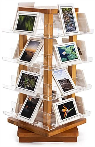 Our spinning wooden literature holder is an easy solution for showcasing a variety of products while saving valuable countertop space. Free standing on a durable oak wood base this rotating four-sided table top display spins a full 360-degrees, allowing customers to browse through merchandise smoothly. Each spinning wooden literature holder features 16 clear acrylic shelves with a 1″ raised ledge designed to keep showcased products securely in place. The 4-tiered design on this revolving fixture can easily hold large quantities of greeting cards, books, art prints, brochures, and more. Perfect for gift shops, drug stores, and boutiques, place our spinning wooden literature holder on cash registers or table top areas to increase last-minute impulse buys. For an attractive showcase that will place your best product right at the customer’s eye level, try this four-sided rotating countertop fixture in your retail store today!