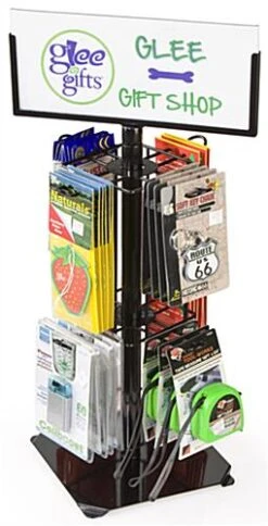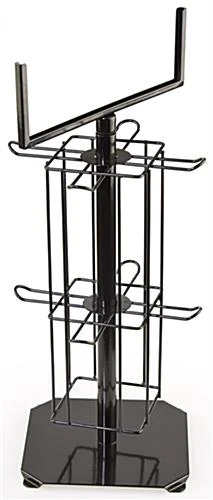 This hook display rack, such as a wire countertop stand, has two tiers for displaying items. Each tier includes (4) pegs for displaying various goods for sale. Each of the pegs is curved up at the end to prevent merchandise from slipping off. This retail counter spinner, hook display rack is designed to hold small blister pack goods, like candy, toiletries, packages of gum, key chains and other accessories. The entire fixture rotates 360°, permitting customers to easily view the entire selection and grab the item they wish to purchase before they check out. This two-tier wire display rack is sure to attract attention with its built-in header area. This enables retailers to add their own custom logo, message or sign. Retailers can make use of the removable header area to present alluring messages to draw the attention of customers. This fixture is typically found in places like bakeries, pharmacies, convenient stores and gift shops, as well as many other retail settings.
