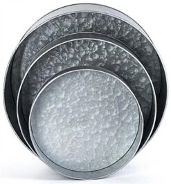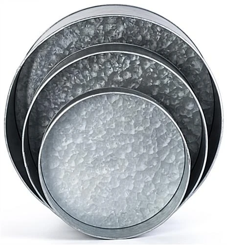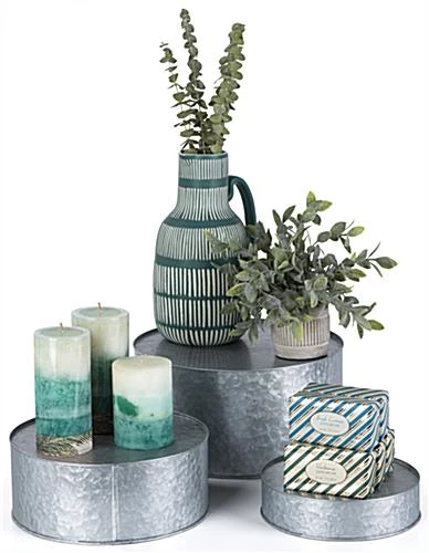 These round galvanized risers come in a set of small, medium, and large sizes to provide you with a unique rustic-looking retail display in your boutique, garden center, jewelry store, or home décor shop. Use these pieces either as pedestals or flip them and use them as a dump bin to showcase smaller items like accessories, knick-knacks, or gift cards! These round galvanized risers have a vintage-looking finish from using a hand-applied distressing technique to create a naturally-aged and worn appearance. Each rustic tabletop pedestal has a 15-pound weight capacity making it great for smaller-scale retail displays. The set comes with three different sizes, 8″, 10″, and 12″ in diameter, to help you create a unique exhibit. Our vintage dump bins can nest within each other for easy transport or storage, making them great for farmer’s markets, art festivals, and craft fairs. These rustic round galvanized risers will make it easy to enhance your retail displays and make your products stand out in any space!