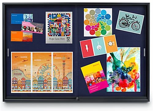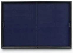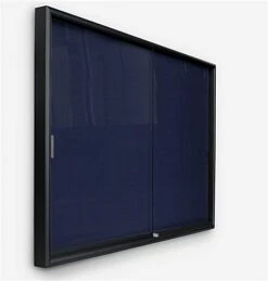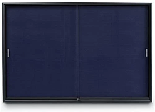 Each school bulletin board, that is used in a classroom, is constructed with rolling guides. The sliding glass doors easily open and close making updating the tackboard hassle-free for a teacher or employee. This school bulletin board that is designed with rolling guides includes all the necessary hardware for mounting the fixture to the wall. Instructions are included to assist customers in installing. A fabric display unit, school bulletin board, features a blue background with a black frame for an attractive fixture in any environment!