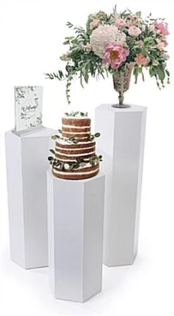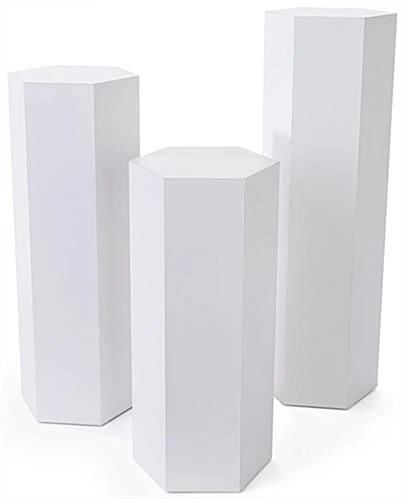 Set of 3 Hexagonal Gallery Pedestals with 30″ 36″ and 42″ Tall Designs