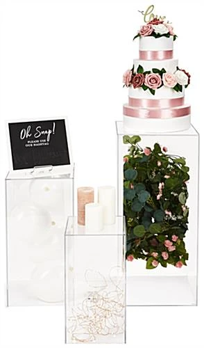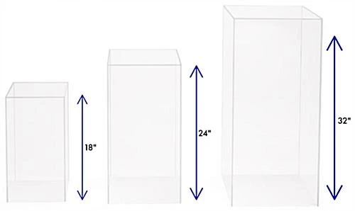 Our clear nested display pedestal set is an elegant and modern way to showcase items at weddings, boutiques, galleries, museums, and more. This riser collection features 18″, 24″, and 32″ tall plinths, providing you with diversity for your retail or event exhibits. This floor standing clear nested display pedestal set is made of 5mm thick acrylic. It has an open bottom allowing you to add balloons, flowers, lights, and more to the vessel’s interior to elevate your space. Each transparent retail riser nests inside of one another, allowing for space-saving storage or easy transport from one event to the next. The surface area for each floor standing acrylic plinth ranges from 10″ to 14″ wide across the three different sizes, making it great for showcasing small items like sculptures, purses, shoes, beauty products, wedding cakes, floral arrangements, and much more! These clear nested display pedestal sets will help make displaying your most prized possessions a simple and easy process, whether in an event venue or retail store!