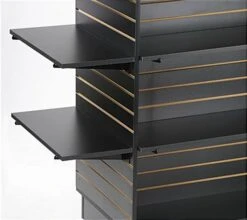 These slat wall fixtures are H-gondolas configured with 2 lengths of slatwall shelves. These retail displays, black slat wall fixtures include (6) 12″d x 24″w and (6) 12″d x 48″w black melamine shelves (brackets are also included). These shelves are durably constructed and can endure all types of moderately heavy retail merchandise. A fully shelved retail unit, these slat wall displays hold (6) shelves on each of their 4 sides. The slat wall fixtures offer flexibility in your retail display merchandising. Add or remove shelves at will, according to your display needs.