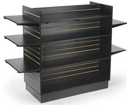 These slat wall fixtures are H-gondolas configured with 2 lengths of slatwall shelves. These retail displays, black slat wall fixtures include (6) 12″d x 24″w and (6) 12″d x 48″w black melamine shelves (brackets are also included). These shelves are durably constructed and can endure all types of moderately heavy retail merchandise. A fully shelved retail unit, these slat wall displays hold (6) shelves on each of their 4 sides. The slat wall fixtures offer flexibility in your retail display merchandising. Add or remove shelves at will, according to your display needs.