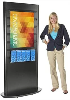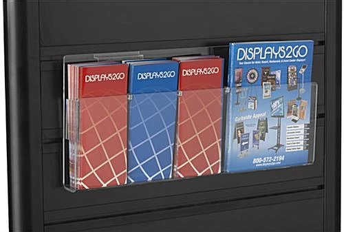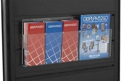 This slatwall tower with posters and brochure holders, built on an elegant black laminated MDF wood base and panel, works well in a store or lobby. Each unit comes with multiple accessories, including 2 clear frames and acrylic literature racks! Designed for 22” x 28” graphics, each sign panel fits securely into the aluminum channels on the slatwall tower display. Affixed to each side of the black fixture are 10 acrylic literature slots, ideal for promoting upcoming sales, new services, and special dates with distribution marketing materials. Easily customize your display with the side insert on the sign frames and the adjustable pocket dividers, allowing various sizes of materials to fit. Try this slatwall tower in your reception area as a beautiful fixture with versatile accessories!