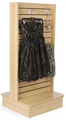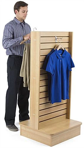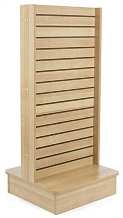 With a double sided view for a versatile showcase, this slatwall panel kiosk is perfect for encouraging shoppers to browse your merchandise. From display hooks to sign holders, the 15 channels per side are compatible with standard accessories, giving you freedom to create custom exhibits. The maple laminate on this floor standing slatwall panel is durable enough for daily wear and tear. A double sided design allows for maximum exposure of your exhibits, ideal for heavy traffic sections like store entrance ways or information centers. Built with sturdy MDF wood on a wide base, this maple fixture is sure to last through years of use. Display hooks, waterfall racks, and more can easily rest in the aluminum channels, making this unit easy to use and refresh as needed. Adaptable for any type of business, use this slatwall panel to create an effective custom showcase!