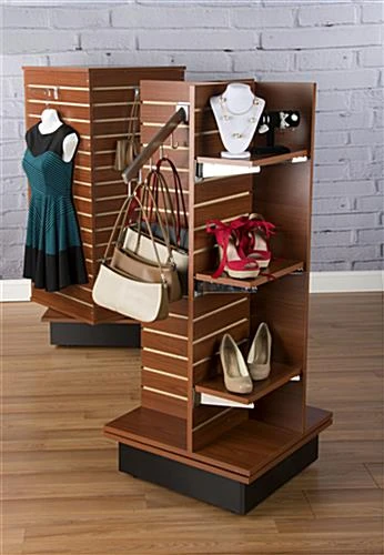 This cherry slatwall pinwheel is a 4 sided rotating display, great for tight areas of your store due to its small footprint and tall design. This store fixture is compatible with lots of gondola shelves, hooks and accessories for displaying a plethora of merchandise. The slatwall pinwheel features 15 channels on each side for displaying goods, and a spinner design for easy viewing. Hidden wheels within the base make this retail display fixture easy to move and place. The melamine build of this pinwheel is durable enough to withstand a throng of visitors.