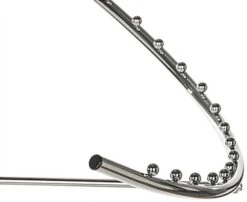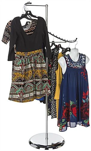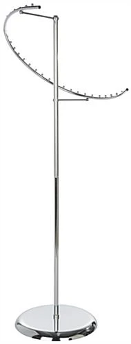 This spiral clothing rack is a metal store fixture that displays garments for any retail shop. The coiled chrome arm features 29 balls to keep garments separated and organized for a clean look. A metal clothing rack saves floor space, therefore creating a structured and professional retail environment. The chrome store fixture offers a simple shopping experience for customers. This clothing rack features a circular weighted base which provides stability and helps accommodates heavier apparel. Create a professional and organized environment with this unique circular stand.