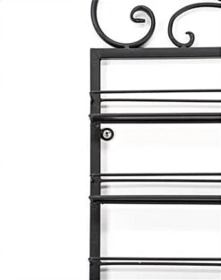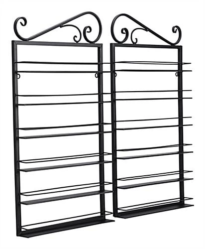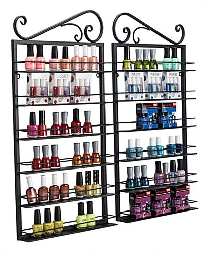 This nail polish rack display is a 2-piece unit that will add character and product merchandising space to the walls in your salon or boutique. Featured atop the wall-mount fixture is a decorative design for added appeal. There are a total of 12 shelves between the two units with a 4 inch clearance and a safety rail to prevent products from falling off the polish rack display. Included with each fixture are 2 black screws and plastic anchors to to wall mount securely. Constructed out of mild steel, the rack display features a powder-coated finish for durability and style. Configure these units separately in your salon for expanded surface space or place them together for a larger product showcase.