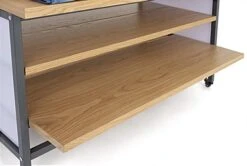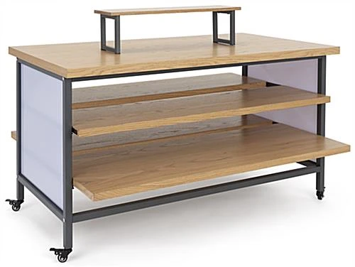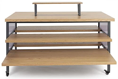 Tiered Display Table with Wheels and Oak Colored Veneer MDF Top