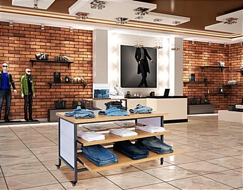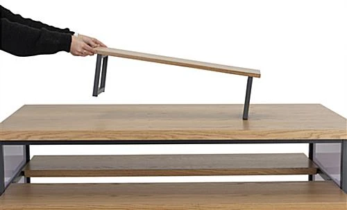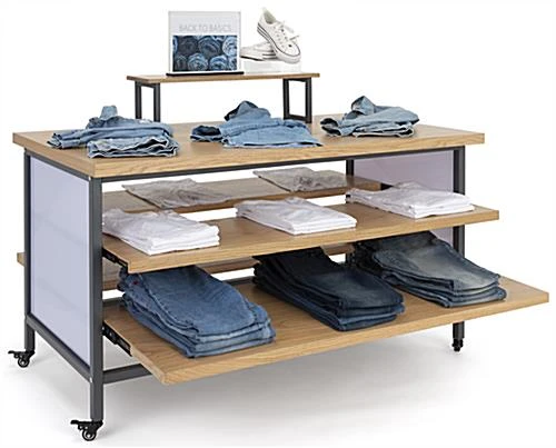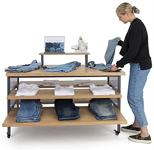 This tiered display table with wheels is a modern way to exhibit merchandise in your retail store, boutique, or clothing outlet. The sleek wood and metal design of this shelving unit features frosted acrylic elements that will suit the aesthetic of almost any space. This spacious tiered display with wheels features lower shelves on rolling glides, allowing you to pull them out or push them in with ease based on your changing showcasing needs. This shelving unit’s overall dimensions are 56.75″ W x 31.5″ H with a weight capacity of 330lbs, providing ample space for your merchandise and product backstock. The small top riser is free-standing and reinforced with scratch-resistant rubber pads, making it perfect for showcasing accessories, samples, or signage to complete your exhibit. The locking casters make this unit highly mobile and easy to move around as you change your retail store’s layout, but also lock when needed to keep your display firmly in place in high-traffic settings. This modern tiered display table with wheels will allow exhibit flexibility in your boutique or gift shop and become a staple in any space for years to come with its timeless design.