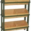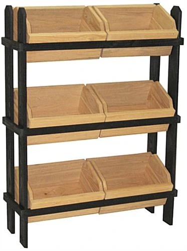 This tiered crate display adds a touch of vintage country charm to any store or café. Built on a solid black pine frame, this rustic wood stand will last for years of busy sales days. The 6 compartments included with this crate display rack feature an oak stain to enhance their natural look. Set on three levels, each bin is 7” deep and spacious enough to showcase a variety of products in your store. Angled for an accessible view, each compartment is easy to remove from the stand, letting you customize this rustic wood unit to match your needs. If you desire a versatile retail fixture with a vintage aesthetic, look no further than this crate display!