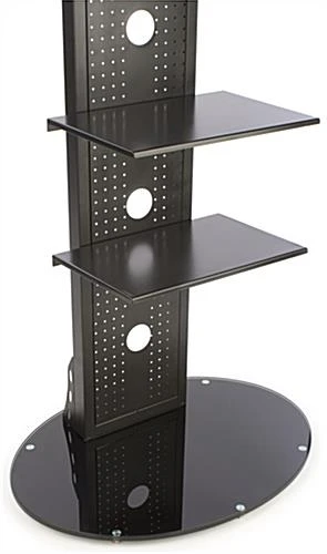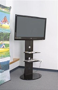 This monitor stand features two metal shelves that can hold various electronics (such as cable boxes, DVD players, and video game systems) to complement your plasma or LCD television. Each TV mount also features cable management ports to place wires through, effectively keeping them out of view to create a tidier display. This black stand can hold a 37″ to 70″ plasma or LCD monitor that weighs up to 165 lbs. With its heavy glass base, this TV mount is very stable and holds large screens securely. Each unit also features tilting brackets that allow you to angle your television 15° up or down to provide the best view. Purchase a stand for use in your home, office, or retail establishment today!