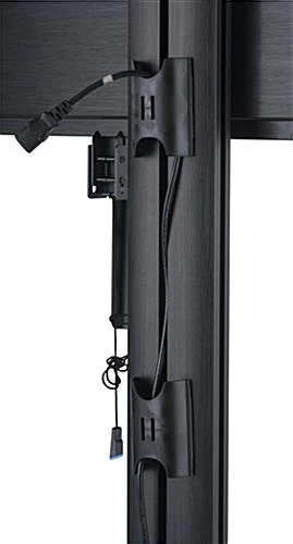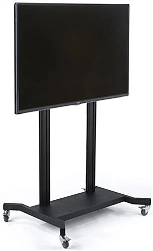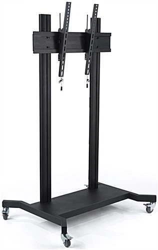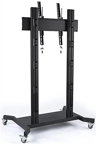 Roll this 110 inch TV stand with wheels from room to room with confidence from the durable steel and aluminum build. Able to accommodate flat screens ranging from 50” to 110”, this black fixture is perfect for businesses or schools looking to showcase a large monitor. The tilting TV stand mount enables you to maneuver the display upwards 5° and downwards 15° for a great viewing experience. Each unit also features a black powder coated finish that looks pleasing with existing décor. Cable management hooks throughout the mount hold unsightly wires out of view. Use the bracket release pulls to quickly release your flat screen from the TV stand without fuss.