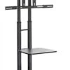 This dual mount TV stand that has a sleek wood veneer finish has an open back design for ventilation. The 6-plug power bar can be installed on the rack to organize the AV devices. This LCD monitor display, dual mount TV stand that is sturdy, is designed to be a lasting fixture in an office. Each technology credenza is designed to hold large screens with a total weight capacity of 400 lbs. This dual mount TV stand that includes rack storage makes it easy to install AV equipment. The standard 19″ rack has 12RU (rack units) of space to accommodate many devices. This dual mount TV stand is ideal for conference rooms that may need to be reconfigured. Wall brackets are a more permanent solution, whereas this credenza can be moved when the meeting table and other furniture is moved. The rack storage slides out and rotates for easy access. The open bays inside of this dual mount TV stand are spacious. The cabinet is an ideal space to hide office supplies, a mini fridge, or other items that are not ideal in plain sight. This dual mount TV stand holds two screens up to 80″ in size for a highly visible video conference. Users can show a presentation on one monitor and a virtual conference on the other!
