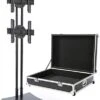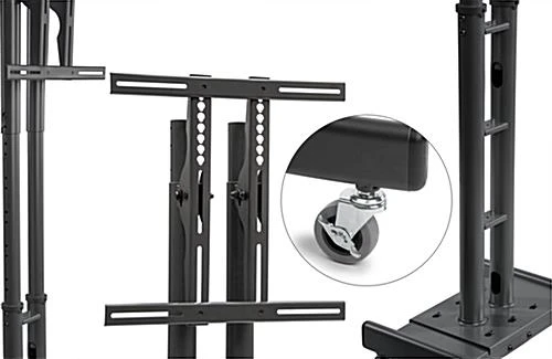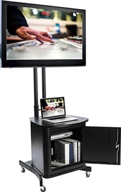 A TV stand with locking cabinet is a great portable entertainment center with a large storage locker and includes a carrying case for the collapsible mount. The extending pole props a mounted flat panel between 51” and 69” to the center of the bracket at a choice of (5) different positions and a tilting bracket positions the LCD at optimal viewing angles. The AV cart included with the LCD mount and locking cabinet has a large storage space with (1) shelf for media supplies, such as extension cords and DVD players, with plenty of room to display literature and merchandise samples on the countertop to advertise products and services at trade shows! Integrated cable management keeps cords and wires organized and out of view while (4) locking caster wheels keep the unit stationary when locked in place. Quickly assemble the flat panel cart & locking cabinet, then disassemble it and place it into the travel case which is lined in EVA foam padding. In addition the case has (2) rolling wheels, (2) recessed handles, and (1) luggage handle for an on-the-go media display! The tilting bracket has a maximum 700×500 VESA capability designed for monitors between 32” and 65” and weighing up to 110lbs.