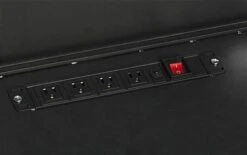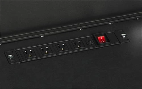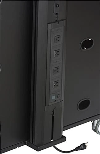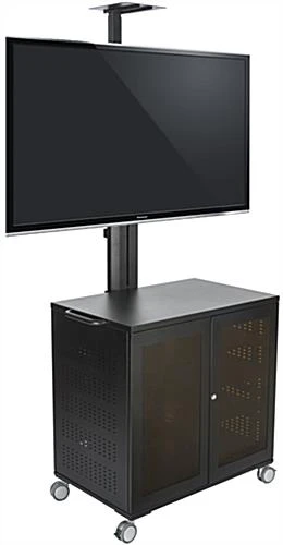 Safely store equipment in this floor standing TV cart with power management. The black display stand cabinet features adjustable shelves and an incorporated electrical strip with an on/off switch. With a maximum capacity of 330lbs, this durable TV cart is capable of confidently holding screens up to 84”. The black powder coated finish on this display stand looks professional and easily blends well into any environment. Enabling mobility from room to room, 4 casters offer an ease of movement when needed while 2 brakes allow stability. Plexiglass cabinet doors allow TV cart devices to remain out of sight while still keeping remote control functionality.