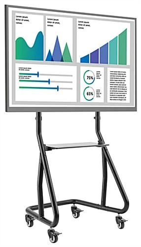 This modern black rolling TV station is height adjustable, ranging from 56″ to 60″, providing attendees the perfect viewing angle during presentations at school, work, trade shows, libraries, and more. The floor standing monitor mount has a heavy-duty bracket that can hold 60″ to 105″ screens up to 220 lbs. Our height adjustable modern black rolling TV station features four locking casters that allow it to move effortlessly between locations and conveniently lock into place for added stability when not in use. Ideal for high-traffic areas, this mobile stand has a heavy-duty steel frame with a powder-coated finish that can withstand years of use. This contemporary cart features a durable AV shelf that can hold up to 55 lbs for storing school or work supplies, equipment, and more. This monitor mount offers anti-theft locking for additional security, ensuring your device will not be tampered with when unattended. Use this adjustable modern black rolling TV station with locking casters to assist your promotions, advertisements, and more during presentations or meetings.