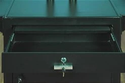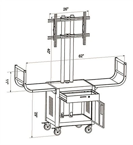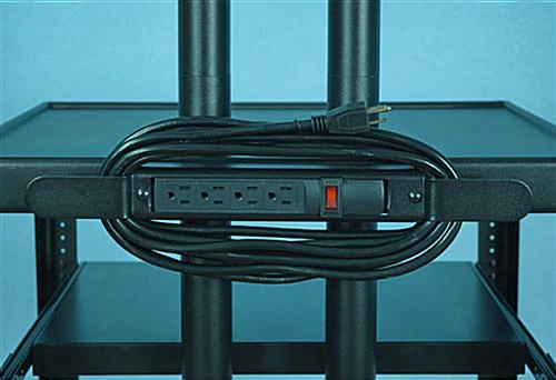 This plasma TV cart supports a flat panel television up to 65” in size. Equipped with 2 curved handles designed to allow easy maneuverability, these attachments also add protection for the large mounted screen. Transport a flat panel monitor and audio visual equipment at once with each rolling TV cart with 4 swivel casters (2 locking). Included with the television stand are a locking cabinet and drawer for presentation materials and additional devices to conveniently be kept out of sight and safely stored. Utilize the top of the pull out drawer as a surface to shelve laptops or other equipment. Fitted with a power strip including 4 outlets and a 15’ cord which can be coiled around the attached winder, each TV cart can be positioned accordingly for optimal viewing.