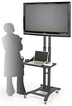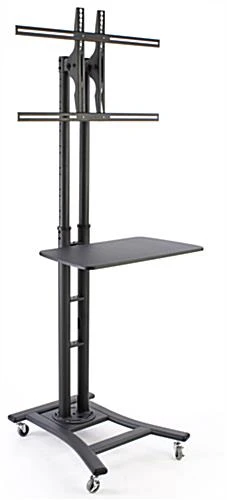 This LED TV stand is designed to hold flat-screen monitors between 37” and 65” that weigh less than 110 pounds. The VESA-compatible bracket fits most brand names and models and has an adjustable design to accommodate mounting patterns between 200×200 to 800×400. This flat panel TV stand with wheels includes a 28-inch-wide equipment shelf that can be positioned at 3 different levels along the floor-standing fixture for presentation accessories. The stand itself is also height adjustable, with 8 set heights at which a monitor may be positioned. This black rolling TV stand is equipped with locking wheels for easy movement throughout a room. Once the fixture is in place, simply lock the casters to keep it in place while in use.
