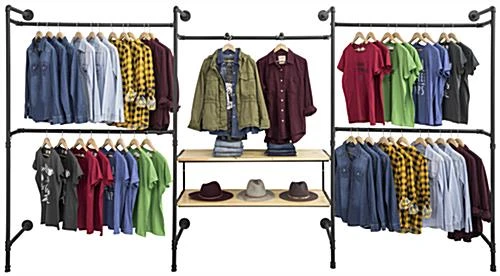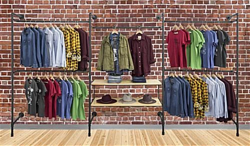 This pipe wall mounted outrigger system will separate you from your competitors with standard retail fixtures. The industrial display’s build allows for customization of each attachment for your specific retail needs. The black wall mounted outrigger system features 4 holes on each post to adjust each accessory to the configuration that best suits your shop. Included with the industrial display are 2 natural wood shelves with a clear stain to complement the matte black powder coated structure. The system also features 1 dual spoke hanging bar for a front facing promotion and 4 clothing hanger racks for a more standard look. Each of the shelves comes with brackets and supporting bars with welded hooks that attach to the frame for sturdiness and a quick assembly.