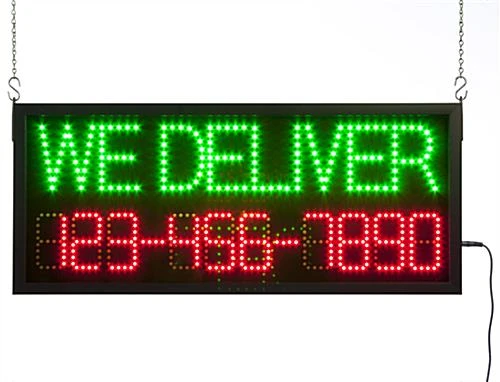 This delivery LED sign with included remote has three modes to capture the attention of customers. The vibrant green and red lights of this display means that existing and potential customers passing by will not be able to miss the message! The delivery LED sign for windows offers an initial setting that steadily displays the message and programmed phone number. The second mode flashes the words, while the third setting illuminates the word one letter at a time. The delivery LED sign that ships fast, also known as business signage, has the phone number remain steady with the last two modes. The number is programmable with the included remote.