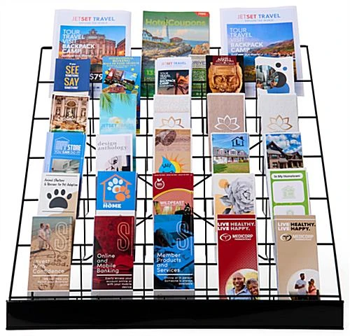 Wire racks showcase your books, CD’s, candies, greeting cards or magazines with a 2-1/2″ deep pocket. Countertop POS holders add extra visibility and attention to your sale items. They’re fabricated with a durable and strong black gloss powder coated finish. At the bottom of each of these racks, there is a black sign channel plate that can accommodate your 29″w x 2-1/2 “h printed messages. We do not include a printed message for the sign channel, the “Banking Services” inserted sign is pictured only as an example of what your custom sign might read.