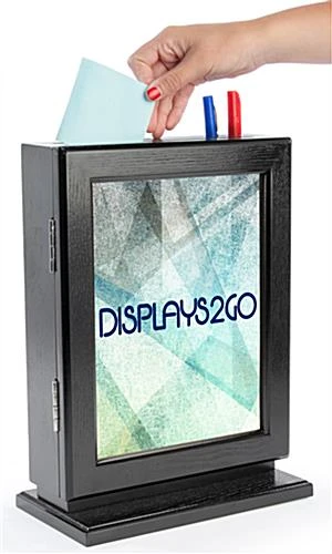 Please note: This ballot box can insert documents up to 8.5″w x 11″h (letter size).