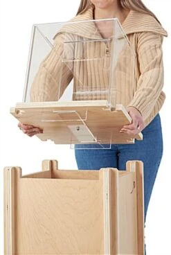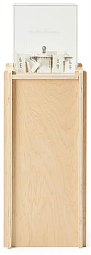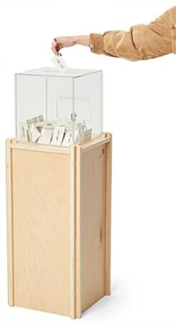 Our floor standing donation box has a beautiful wooden pedestal and a recyclable acrylic topper, making for an eco-conscious product design. This display is great for charity collections, fundraising events, auctions, donations, and more! Each wooden floor standing donation box features a 7″ wide slot on the acrylic top, making it easy to drop in money, tickets, or cards. The back of the unit features a locking door with two keys included, allowing secure access to your donations or contest entries. This 44″ tall poplar wood display requires no complex tools or hardware for assembly, granting you the ability to get the unit set up in minutes. The charity collection pedestal ships in a flat-pack design, making it easy to transport to trade shows and fundraising events. Our eco-conscious floor standing donation box is an excellent solution for museums, convention centers, non-profits, and hotels, providing a wide range of end uses for their business.