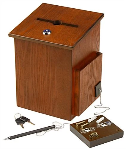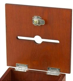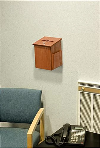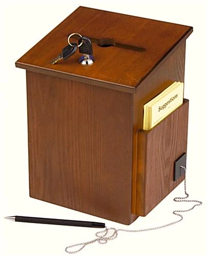 This charity box features a locking top and a set of two keys. The lock ensures that passersby cannot tamper with contents. This ballot collection container has a side pocket for dispensing blank testimonial forms and the like. This charity box has a contemporary dark oak finish, beautifully complementing myriad retail or business environments. A pocket provides easy access to forms for passersby, and the 4-3/4″w pocket accommodates various blank forms. A comment display helps business owners and managers is a helpful tool for learning what suggestions and improvements are desired in offices, retail establishments, and recreations halls; it also works for collecting money for fundraisers and charity events. This wood collection holder comes with a chain pen that conveniently attaches to the side of the display. This suggestion box is a great charity tool to be placed on a desk or countertop, but can also be wall-mounted. Instructions are included to make hanging easy. To buy the suggestion forms pictured (purchased separately), see related products to the right. This charity box, also known as a comment bin, is beautifully crafted and as functional as it is stylish.