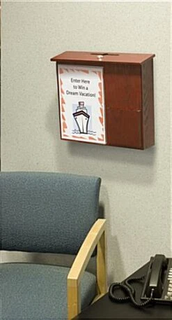 A comment box, also known as a suggestion box, is a superb addition to offices, lobbies, and retail stores. This comment box has a locking top. The locking door comes with a set of (2) keys, and allows the display to be placed unsupervised with the confidence that the contents are safe. The comment box has a front pocket to hold suggestion forms or other similar documents. This comment box, suggestion holder has a red mahogany finish that stands out in any location.
