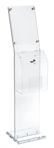 A comment box, also known as a suggestion box, is a superb addition to offices, lobbies, and retail stores. This comment box has a locking top. The locking door comes with a set of (2) keys, and allows the display to be placed unsupervised with the confidence that the contents are safe. The comment box has a front pocket to hold suggestion forms or other similar documents. This comment box, suggestion holder has a red mahogany finish that stands out in any location.
