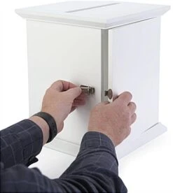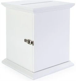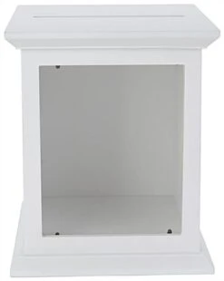 This white card box with photo frame is a modern display solution ideal for collecting donations, entry forms, raffle tickets and more! Suitable for weddings, church events, school dances, or fundraising functions, this single-sided wooden fixture can securely house a high amount of forms and envelopes while holding up to an impressive 17 pounds of content within the heavy-duty matte MDF frame. Personalize this white card box with 8″ x 10″ acrylic picture frame by adding photos, signage, or art prints to the sign holder. The 10.25″ wide top slot provides guests with ample space to effortlessly insert envelopes and forms into this fixture. This modern white card box features a rear door opening with latch closure to keep valuables safe from tampering and grants easy access to contents when needed. As an added benefit, this display with acrylic sign holder ensures the privacy of voting forms and suggestions with its fully enclosed wooden frame. This decorative card box ships fully assembled, allowing you to showcase each fixture on any tabletop within minutes!