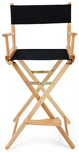 This director chair is a great addition to any trade show exhibit or presentation. The bar height chair, director chair stands 29″ high, making it perfect for positioning near a tall counter. You can also use this director chair to provide visitors with a place to rest or even as a focal point for promotional events. This director chair, also known as folding chairs, features a black cotton canvas seat and seat back for stability and strength. In fact, the cotton canvas can hold up to 220 pounds of weight! We even sell the director chair with safety locks and rubber feet to further protect a user from injury.