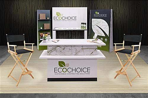 The director chair is constructed from rubberwood trees, creating an ecologically-friendly yet attractive trade show display. This portable chair, director chair features a natural wood finish comparable to Teak, while its strength equals that of Maple. The director chair, such as folding chairs and bar height trade show chairs, also includes a footrest, ultimately making it even more comfortable. This director chair is equipped with hinged legs and armrests to make traveling between events even easier. Incorporate this portable director chair into your next trade show event to truly create a warm and more approachable display.