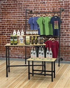 This large pipe retail table is constructed out of durable pine wood with a natural stain for industrial appeal. With pre-drilled holes on the surface of the fixture, you have the option of 2 tiers to capitalize on the sales space in your boutique store. The small tabletop of the industrial pipe retail table is 10” above the bottom surface for room to display a variety of products. On the base of the fixture are rubber feet to prevent sliding and scratching your sales floor. The tabletop surfaces feature a clear coat to protect the wood while keeping the natural appearance. The pipeline structure that makes up the frame creates an industrial appearance to complement your boutique store.