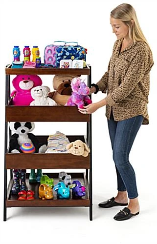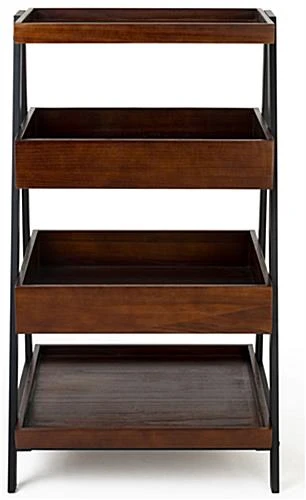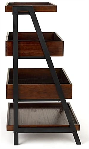 Create stunning product displays with these rustic wooden dump merchandising shelves. With multiple levels, this dark brown furniture featuring sturdy black metal powder-coated frames is ideal for everyday retail use. These rustic dump merchandising shelves feature a lip around the edge of each level to help keep your product from slipping. Placing this four-tiered table alongside your existing store fixtures not only provides an abundance of display area, will add to the decor. These shelving units are easy to assemble, meaning retailers can put them on the store floor quickly. The multiple levels featured with these wooden merchandising shelves help to create a high-density showcase in your store environment.