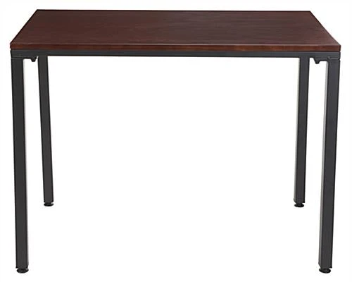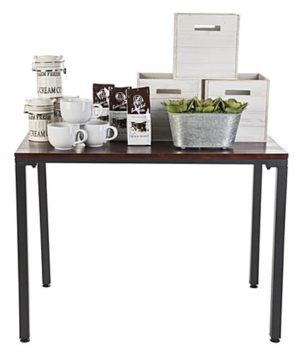 Stylize a tall industrial pipe table display to showcase your best retail merchandise. Add a modern rustic feel with this rich mahogany wood and black metal leg fixture. Position this steampunk-inspired industrial pipe table display appropriately to entice customers. Black metal legs with a mahogany wood top provides a modern rustic furniture piece. Pair the table display with other fixtures for a coordinated collection. Use residentially or commercially to achieve a vintage-style atmosphere!